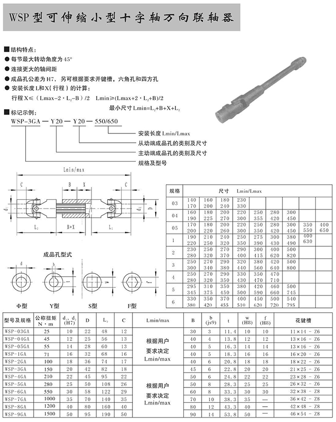 瑞安市寶德隆機械配件有限公司提供WSP型可伸縮小型十字軸萬向聯(lián)軸器具有拆裝方便,快速安裝等特點,廣泛用于連接/固定輪轂孔和零件的軸,例如齒輪,錐齒輪,鏈輪,葉輪,凸輪,皮帶輪和飛輪等軸的聯(lián)結(jié)固定,咨詢電話:18906872378